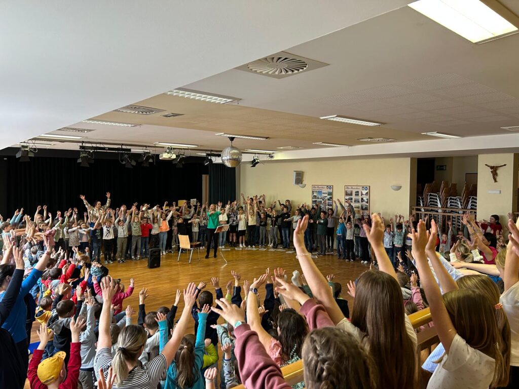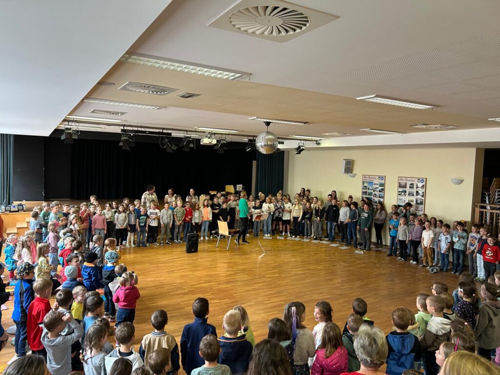 Zu Beginn sangen wir gemeinsam „Singen ist ne coole Sache“. Mit sichtbarer Freude und hörbarem Einsatz trugen ca. 270 Kinder unterschiedliche Lieder vor.